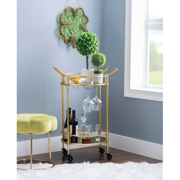 Impress your friends with this elegant, vintage chic round gold metal bar cart with handles and mirrored tops. Mixing industrial design with modern flair, the linon round bar cart is sure to impress. Showcasing a tubular silhouette cast in a gold finish, this charming design. For wine glasses, wine racks, side tables, and stemware, visit amazon. This gold metal bar cart has two mirrored tempered glass shelves, two handles, and four locking caster wheels for easy mobility.